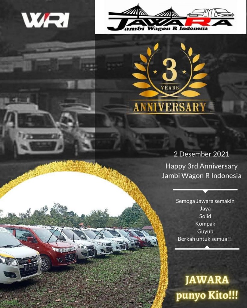 Wagon R Indonesia – WRI Chapter Jambi yang beken dengan nama JAWARA yang merupakan singkatan dari Jambi Wagon R Indonesia pada hari Minggu, 5 Desember 2021 menggelar perayaan Ulang Tahun nya yang ke 3 di Lokasi Candi Muaro Jambi. Jawara yang punya slogan “Jawara Punya Kito” ini merupakan Chapter ke 23 yang di kukuhkan pada tanggal 2 Desember 2018 dengan Surat Keputusan Pengurus Pusat WRI Nomor : A.021/Pengukuhan Chapter/WRI/XII/2018 dinyatakan SAH telah menjadi Bagian Keluarga Besar Wagon R Indonesia. Walau bukan chapter pertama yg secara resmi terbentuk, pengukuhan chapter Jambi ternyata menjadi cermin daerah daerah lain utk juga merapatkan barisannya demi terbentuk chapter didaerah masing-masing.